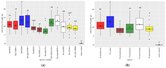 Soft rot loss of weight for in vitro potato slices infected with the different 12 isolates (a) or species (b) in the slices assay for 2020. Box plots of 20 repetitions for each isolate or 40 repetitions for each species; x indicates the mean; middle black line indicates the median. Different letters indicate statistical differences, according to pairwise multiple comparison (ANOVA based) of the mean value between the strains.