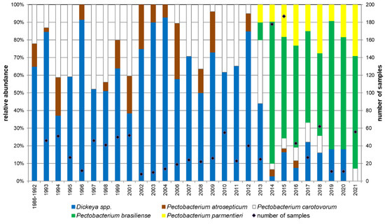 Relative abundance of different potato blackleg-inducing bacterial species sampled during the yearly Swiss survey from 1993 to 2021. Data until 2018 are already published elsewhere [11].