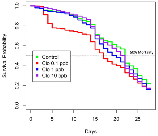 Kaplan–Meier survival curves of bees in each experimental group during the 28-day cage experiment. The y-axis represents the Kaplan–Meier estimates of the survival probability. The x-axis represents the experimental days. The red, blue and violet curves represent survival probability of honeybees exposed to 0.1, 1 and 10 ppb clothianidin, respectively. The green curve represents the survival rate of honeybees supplemented with 50%w/v sucrose solution only.
