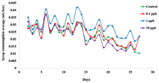 Syrup consumption average per honeybee differed in all groups (Figure 2), with a significant difference between control and all exposed groups (Wilcoxon test, p < 0.001), suggesting a treatment effect on feeding rates (Supplementary Materials Table S3). Bees from the 1 ppb group consumed more syrup than the other experimental groups (Figure 2) and exhibited a significant difference at T 25 relative to the control (p < 0.05) (Supplementary Materials Table S4). For bees exposed to 0.1 ppb, we observed only a significant difference of the syrup consumption average per honeybee at T 6 relative to the control (p < 0.05) (Supplementary Materials Table S4). However, honeybees exposed to 10 ppb showed no significant differences in the syrup consumption average per honeybee at any time points relative to the control (Supplementary Materials Table S4).