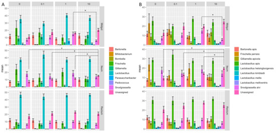 Mean of the relative activity of the 10 most dominant microbial ASVs summarized at (A) the genus and (B) species level in the honeybee gut sections (midgut, ileum and rectum) isolated from bees exposed only to sucrose syrup (0 ppb) and to three clothianidin pesticide concentrations (0.1, 1 and 10 ppb). Significant differences between the mean of the relative activity of the 10 most dominant microbial ASVs among the different experimental groups were calculated using pairwise comparisons in a Wilcoxon rank test (p < 0.05) corrected with the FDR method. n = 10 replicates per experimental condition (2 pools of 5 worker bees per cage; 5 cages per group, 50 bees per group). “*” p <0.05.