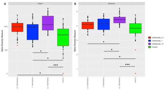 Bar plots showing the alpha diversity measures of (A) Chao1 estimated species richness and (B) Shannon diversity in all honeybee gut sections exposed to different clothianidin (0.1 ppb). We used 2 pools (2 replicates) of 5 workers per cage; 3 cages per group; 10 replicates per experimental condition. Significant differences between the alpha diversity measures of the different experimental groups were calculated using the Kruskal–Wallis test (p < 0.05) followed by a Dunn’s test (p < 0.05), the p-values were adjusted with the Benjamini–Hochberg correction method. “*” p < 0.05; “***” p < 0.001.