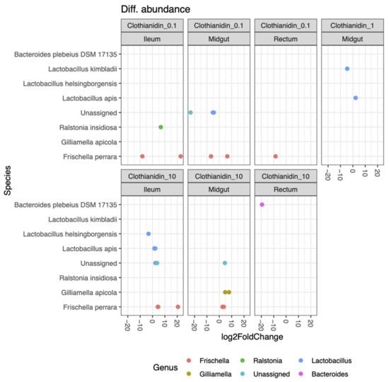 Differential activity of ASVs (total) that were significantly different (p < 0.05) between each experimental gut section (midgut, ileum and rectum) exposed at 0.1 ppb, 1 ppb and 10 ppb compared with the unexposed group (control) (10 replicates per experimental condition). Negative fold change scores (log2) indicate genera with decreased activity in Clothianidin-treated samples, and positive fold change scores indicate genera with increased activity. Each point represents an ASV. Only significant difference in genera activity (Adj-p < 0.05) is shown.