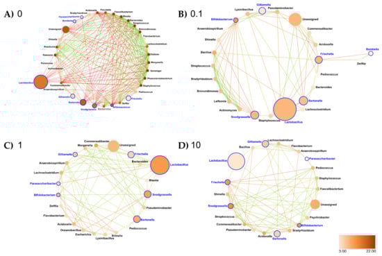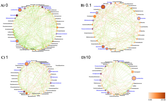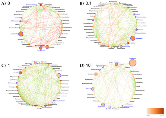Figure 7. Interaction networks were generated based on pairwise correlations between the relative abundance of different bacterial genera for the ileum exposed at (A) 0 ppb, (B) 0.1 ppb, (C) 1 ppb and (D) 10 ppb. We used 10 replicates (5 workers per replicate) per experimental condition. Each node represents a bacterial genus. The size of each node is proportional to the bacterial functional activity of each genus. The darker the node, the more interconnected it is. Each edge represents significant positive or negative Spearman correlation coefficients (−1 ≤ r ≤ −0.4) (negative, red) and (0.4 ≤ r ≤ 1) (positive, green); (FDR-adjusted p-value < 0.05).