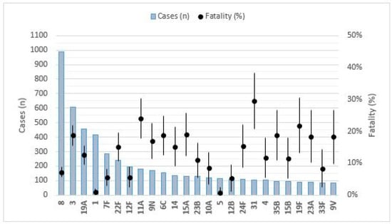 Twenty-five serotypes comprised 87.8% of the isolates. The more frequent serotypes were 8 (16.5%; incidence 1.09 per 100,000 population), 3 (10.1%; incidence 0.67 per 100,000), 19A (7.6%; incidence 0.5 per 100,000), 1 (6.9%; incidence 0.46 per 100,000), 7F (4.8%; 0.31 incidence per 100,000), 22F (4.0%; incidence 0.26 per 100,000), 12F (3.2%; 0.21 incidence per 100,000), and 11A (3.0%; incidence 0.20 per 100,000). The specific fatality rate varied among serotypes (Figure 1).