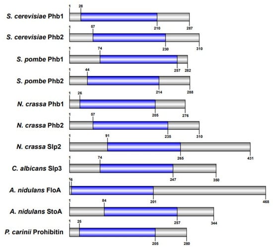 Schematic of fungal SPFH proteins. SPFH proteins that have been experimentally validated in fungi are depicted. Sequences for each protein were obtained from the Saccharomyces Genome Database, PomBase, Candida Genome Database, Aspergillus Genome Database, or UniProt [59,65,66]. SPFH/Band 7 domains (blue) were identified using InterProScan [67]. Schematics were constructed and drawn to scale using Illustrator for Biological Sequences [68].