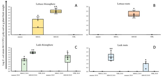 Colonization, as determined by E. coli strain 0611-specific colony formation, of rhizosphere soils (A,C) and roots (B,D) of lettuce plants sampled at 39 DAP (A,B) and of leek plants sampled at 90 (2018) and 272 DAP (2019) (C,D), grown in soils under four different treatment regimens (manure, M0611H, M0611L, NPK). Bars marked with * and ** indicate significant difference (p ≤ 0.05) in average Log CFU values between soil treatments, whereby ** > *.