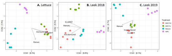 Canonical correspondence analysis (CCA) on bacterial community composition of rhizosphere soil samples revealed separate clustering per treatment. Vectors in the biplots (Figure 2) indicate significant impacts of treatments on the bacterial community structures of lettuce, leek 2018 and leek 2019 rhizosphere soils. The first two axes in the CCA biplot explained 17.1% for lettuce, 14.4% for leek 2018 and 14.8% for leek 2019, of all variation between samples. Treatment with NPK always led to segregation from manure, M0611H and M0611L samples, whereas treatment with manure occasionally led to segregation from M0611H and M0611L samples in cases of lettuce and leek 2019 treatments. Soil treatments M0611L and M0611H led in two cases (leek 2018 and leek 2019) to segregation of samples, whereas the leek 2018 samples resembled each other more under manure and M0611H than the ones under M0611L and NPK treatments. The impact of ‘manure’ by comparing samples under NPK and manure treatments and the impact of ‘presence of strain 0611′, by comparing M0611H and manure treatments with each other by performing PERMANOVA on Bray-Curtis distance matrix values revealed significant differences (p values between 0.008 and 0.033 and R2 values between 0.15 and 0.24, respectively) in all three plant treatments.