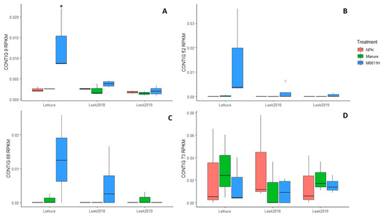 Normalized numbers of E. coli strain 0611 genomic reads, identical to contigs 9 (A), 52 (B), 68 (C) and 73 (D), in metagenomes of lettuce, leek 2018 and leek 2019 rhizosphere soils under three soil treatment regimens (manure, M0611H, NPK) and expressed in RPKM values. Average RPKM value marked with * indicate significant difference (p = 0.001) from other values of the same contig.
