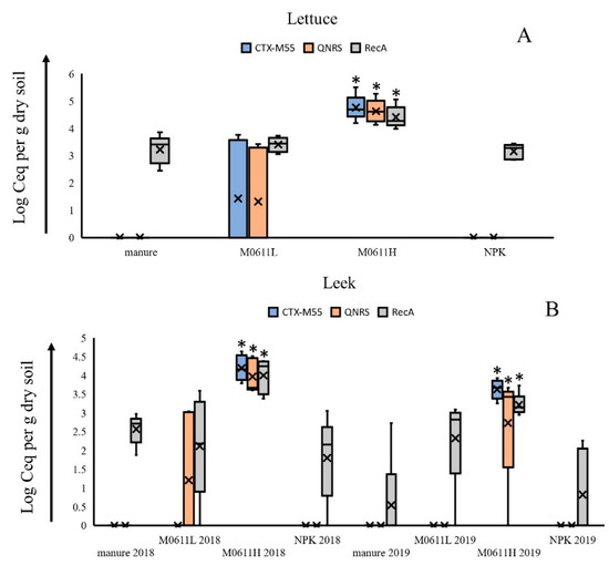 Molecular quantification of bla CTX-M-55, qnrS1 and recA loci located on the strain 0611 genome and expressed in Ceq values in lettuce (A) and leek (B) rhizosphere soils under four treatment regimens, as determined by TaqMan. Average values marked with * indicate significant difference (p ≤ 0.05) from values of the other soil treatments determined with the same TaqMan system.