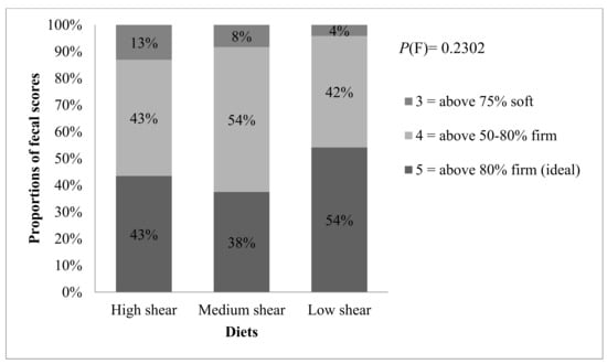 Relative proportions of stool scores for dogs fed dietary treatments produced at high, medium and low shear diets (n = 23, 24 and 24, respectively).