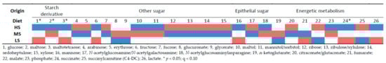 Heatmap of fecal saccharides metabolomics of dogs (n = 24) fed diets produced at high, medium and low shear (HS, MS and LS, respectively). Specific analytes were numbered 1 to 26 and grouped as starch derivatives, other sugars, epithelial sugars and energetic metabolism. Estimate treatment means expressed in the Log2 scale were color coded within each metabolite across diets on a color scale. Blue indicates a relative concentration lower than the other treatments, white indicates an intermediate relative concentration, and red indicates a higher relative concentration than the other treatments.