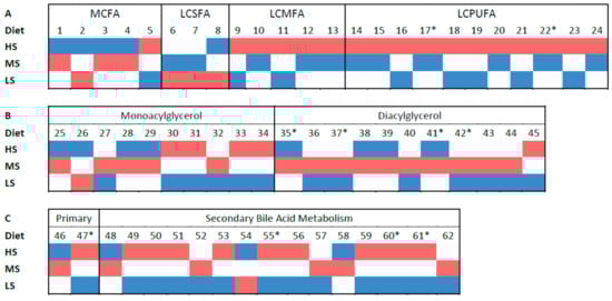 Fecal lipid metabolism analytes heatmap of dogs (n = 24) fed diets produced at high, medium and low shear (HS, MS and LS, respectively), with each individual group of analytes ((A): MCFA, medium-chain fatty acids; LCSFA, long-chain saturated fatty acids; LCMUFA, long-chain mono-unsaturated fatty acids; LCPUFA, long-chain poly-unsaturated fatty acids. (B): monoacylglycerols and diacylglycerols. (C): primary and secondary components of bile salt metabolism). Log2 values were conditionally formatted within each metabolite across diets on a color scale. Blue indicates a relative concentration lower than the other treatments, white indicates an intermediate relative concentration, and red indicates a higher relative concentration than the other treatments. (A): 1, caproate (6:0); 2, heptanoate (7:0); 3, caprylate (8:0); 4, caprate (10:0); 5, 5-dodecenoate (12:1n7); 6, palmitate (16:0); 7, stearate (18:0); 8, arachidate (20:0); 9, palmitoleate (16:1n7); 10, 10-heptadecenoate (17:1n7); 11, oleate/vaccenate (18:1); 12, 10-nonadecenoate (19:1n9); 13, erucate (22:1n9); 14, hexadecadienoate (16:2n6); 15, hexadecatrienoate (16:3n3); 16, linoleate (18:2n6); 17, stearidonate (18:4n3); 18, docosadienoate (22:2n6); 19, mead acid (20:3n9); 20, adrenate (22:4n6); 21, arachidonate (20:4n6); 22, eicosapentaenoate (EPA; 20:5n3); 23, docosapentaenoate (n6 DPA; 22:5n6); 24, docosahexaenoate (DHA; 22:6n3). (B): 25, 1-palmitoylglycerol (16:0); 26, 2-palmitoylglycerol (16:0); 27, 1-palmitoleoylglycerol (16:1); 28, 2-palmitoleoylglycerol (16:1); 29, 1-heptadecenoylglycerol (17:1); 30, 1-oleoylglycerol (18:1); 31, 2-oleoylglycerol (18:1); 32, 1-linoleoylglycerol (18:2); 33, 2-linoleoylglycerol (18:2); 34, 1-linolenoylglycerol (18:3); 35, palmitoyl-linoleoyl-glycerol (16:0/18:2); 36, palmitoyl-linoleoyl-glycerol (16:0/18:2); 37, diacylglycerol (16:1/18:2 [], 16:0/18:3 []); 38, oleoyl-oleoyl-glycerol (18:1/18:1); 39, oleoyl-linoleoyl-glycerol (18:1/18:2); 40, oleoyl-linoleoyl-glycerol (18:1/18:2); 41, linoleoyl-linoleoyl-glycerol (18:2/18:2); 42, linoleoyl-linoleoyl-glycerol (18:2/18:2); 43, linoleoyl-linolenoyl-glycerol (18:2/18:3); 44, linoleoyl-linolenoyl-glycerol (18:2/18:3); 45, linolenoyl-linolenoyl-glycerol (18:3/18:3). (C): 46, cholate; 47, taurocholate; 48, 12-dehydrocholate; 49, 12-ketolithocholate; 50, 3b-hydroxy-5-cholenoic acid; 51, 3-dehydrodeoxycholate; 52, 6-oxolithocholate; 53, 7alpha-hydroxycholestenone; 54, 7-ketodeoxycholate; 55, dehydrolithocholate; 56, deoxycholate; 57, deoxycholic acid 12-sulfate; 58, hyocholate; 59, isohyodeoxycholate; 60, lithocholate; 61, taurodeoxycholate; 62, ursocholate. * p < 0.05; q < 0.10.