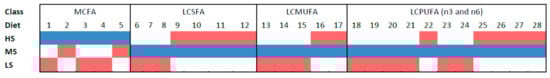 Serum non-esterified fatty acids heatmap of dogs (n = 24) fed diets produced at high, medium and low shear (HS, MS and LS, respectively), with each individual group of fatty acids (MCFA: medium-chain fatty acids; LCSFA: long-chain saturated fatty acids; LCMUFA, long-chain mono-unsaturated fatty acids; LCPUFA, long-chain poly-unsaturated fatty acids). Log2 values were conditionally formatted within each metabolite across diet on a color scale. Blue indicates a relative concentration lower than the other treatments, white indicates an intermediate relative concentration, and red indicates a higher relative concentration than the other treatments. 1, heptanoate (7:0); 2, caprylate (8:0); 3, caprate (10:0); 4, laurate (12:0); 5, 5-dodecenoate (12:1n7); 6, myristate (14:0); 7, pentadecanoate (15:0); 8, palmitate (16:0); 9, margarate (17:0); 10, stearate (18:0); 11, nonadecanoate (19:0); 12, arachidate (20:0); 13, palmitoleate (16:1n7); 14, 10-heptadecenoate (17:1n7); 15, oleate/vaccenate (18:1); 16, 10-nonadecenoate (19:1n9); 17, erucate (22:1n9); 18, hexadecadienoate (16:2n6); 19, hexadecatrienoate (16:3n3); 20, linoleate (18:2n6); 21, stearidonate (18:4n3); 22, arachidonate (20:4n6); 23, eicosapentaenoate (EPA; 20:5n3); 24, heneicosapentaenoate (21:5n3); 25, docosadienoate (22:2n6); 26, docosatrienoate (22:3n3); 27, docosapentaenoate (n6 DPA; 22:5n6); 28, docosahexaenoate (DHA; 22:6n3).