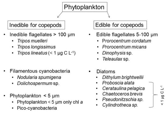 Temperate coastal phytoplankton communities in summer are less diatom-dominated and instead consist of pico/nano-plankton with cells <5 µm and flagellates 5–100 µm in diameter, large flagellates >100 µm in their longest axis, and of filamentous cyanobacteria. Besides flagellates 5–100 µm in diameter, these groups are inaccessible for mesozooplankton grazers. Hence, coastal summer phytoplankton is considered mainly bottom-up regulated via nutrient supply and predicted to be rather directly affected by elevated SST instead of indirectly via grazing. In fact, the few experiments with natural Baltic Sea summer communities and field data from the Central Baltic Sea (1979–2011) showed an increase in phytoplankton biomass either due to temperature driven increase in picoplankton and ciliates, the latter being grazed by copepods [], or in smaller cells and diazotrophic filamentous cyanobacteria [], both inaccessible to copepods. Contrasting results that showed lower biomass under elevated SST in a natural nutrient-limited summer community of Kiel Fjord [] could be explained by unexpected high copepod abundance and thus increased grazing activity as the underlying reason.