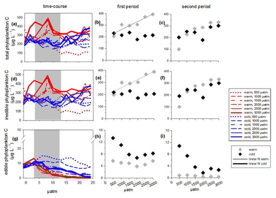Phytoplankton carbon (µg C L −1) over the entire course of time and as mean values of the first and the second period. The first period, during which a bloom in the warm treatments occurred, is marked in grey color in the subpanels (a), (d), and (g). (a–c) Total phytoplankton carbon, (d–f) inedible phytoplankton carbon, (g–i) edible phytoplankton carbon. Symbol attribution to treatment combinations (temperature treats + CO2 target values) are given in the legend. Fitted lines indicate a significant response of phytoplankton relative contribution to CO2 at the different temperature levels.