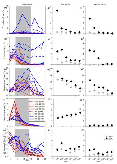 In contrast to our hypotheses, flagellates were overall negatively affected by both increasing water temperature and CO2 (rejecting hypotheses 1, 2, partly 3). Both edible flagellates (Prorocentrum spp.) and the inedible flagellate taxa Tripos nearly disappeared during the second (post-bloom) period in the warm treatments (Figure 3c,l; Figures S2 and S3 (Supplementary Materials)). Thus, responses seem to be both taxa/group specific and trait-based, i.e., directly treatment-induced and indirectly via grazing (in details discussed below). Our results are in line with studies from the Central Baltic Sea [] and the Mediterranean Sea [], where species of the taxa Tripos shifted occurrence from summer to late autumn or disappeared from the surface to deeper and colder water layers due to increasing SST. A 50-year time series (1960–2009) of the North Sea and the northeast Atlantic further detected a decline in dinoflagellate abundance and particularly of the dinoflagellate species C. furca and Prorocentrum spp. []. Following Tunin-Ley et al. [], for instance the taxa Tripos sp. Responses are quite sensitive to increasing SST and are even discussed as an indicator taxa for climate change [].