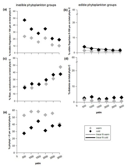 The edible faction of total phytoplankton C and its component groups and species (see Figure 1) were of minor importance and decreased under elevated temperature (diatoms, flagellates 5–100 µm) and CO2 (flagellates 5–100 µm, already discussed above). Temperature effects go in line with previous studies on natural plankton communities including mesozooplankton grazers, mainly investigating phytoplankton spring and autumn blooms, where the edible group (mainly diatoms and/or flagellates) dominates the phytoplankton community. In these studies, the decrease was explained by temperature-induced enhanced mesozooplankton copepod grazing, e.g., [,,,]. Mesozooplankton analyses of this experiment by Garzke et al. [] detected a temperature-induced ontogenetic shift of the stage distribution of the copepod A. tonsa. While cold treatments were mainly adult-dominated at the end of the experiment, warm treatments showed a considerably higher number of younger stages, explained by warming-induced faster reproduction and development of a new nauplii generation []. Overall, this led to a significantly higher total mesozooplankton abundance in the warm treatments compared to the cold ones (warm treatments: 13–47 individuals L−1; cold treatments: 1–14 individuals L−1; p (temperature) = 0.0065; oral communication by Garzke, J. 2020; []), which considerably enhanced grazing on the edible phytoplankton fraction in the warm treatments.