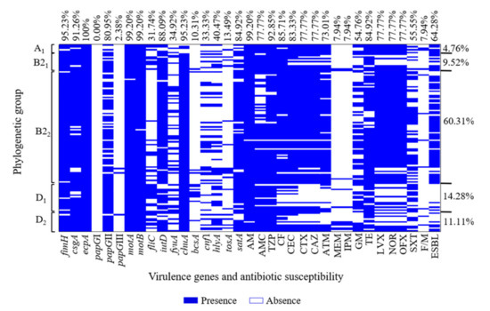- Bozcal, E.; Eldem, V.; Aydemir, S.; Skurnik, M. The relationship between phylogenetic classification, virulence and antibiotic resistance of extraintestinal pathogenic Escherichia coli in İzmir province, Turkey. PeerJ 2018, 6, e5470. [Google Scholar] [CrossRef] [PubMed]