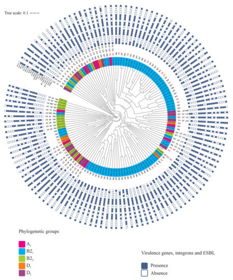 2.5. Typing of Phylogenetic Groups, Virulence Genes, and Integrons Associated with UPEC O25b Strains