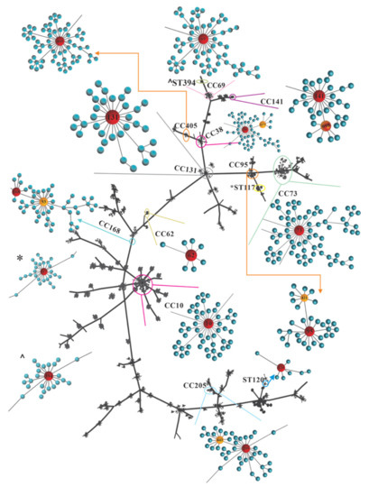 - Feil, E.J.; Li, B.C.; Aanensen, D.M.; Hanage, W.P.; Spratt, B.G. eBURST: Inferring patterns of evolutionary descent among clusters of related bacterial genotypes from multilocus sequence typing data. J. Bacteriol. 2004, 186, 1518–1530. [Google Scholar] [CrossRef] [PubMed]