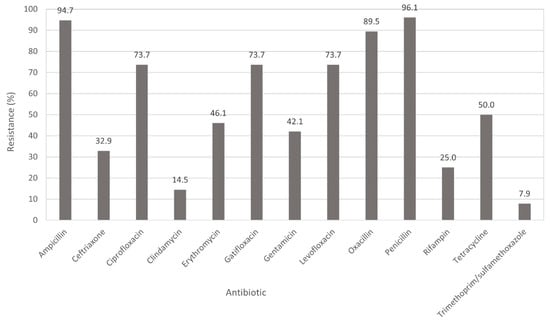 Percent resistance of Staphylococcus aureus (n = 76) to tested antimicrobials using broth microdilution. No resistance to daptomycin, linezolid, high-level streptomycin, Quinupristin/Dalfopristin, tetracycline, or vancomycin was detected.