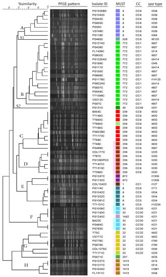 Pulsed-field Gel Electrophoresis (PFGE) analysis and genetic profiles (Multilocus Sequence Typing (MLST), clonal complex (CC), and spa types) of MRSA from clinical samples. DNA for PFGE was digested with SmaI. Levels of similarity were determined using Dice coefficient and the unweighted pair group method (UPGMA). PFGE clusters were determined using a 75% similarity cutoff and labeled A–H. Sample source Isolate ID: B = blood, CDL = cannula double lumen, FL = fluid. TT = tracheal tube, VS = vaginal swab.