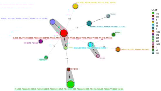 Minimum spanning tree (MST) of Multilocus Sequence Typing (MLST) of the examined clinical Staphylococcus aureus from humans. Each circle corresponds to an individual MLST type; the circle size is proportional to the number of isolates belonging to the same MLST type. The color of each circle denotes the MLST type. Connecting lines (solid and dashed) between circles represents allelic variations between MLST types; the grey shadowing indicates no more than one different loci between MLST types.