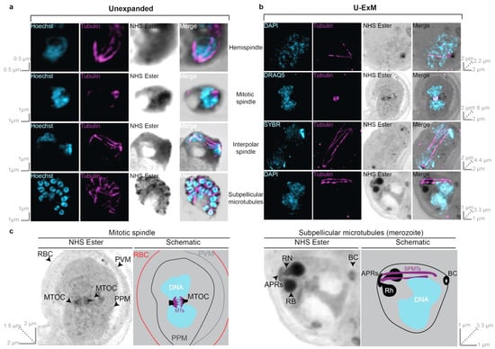 - Rashpa, R.; Brochet, M. Ultrastructure expansion microscopy of Plasmodium gametocytes reveals the molecular architecture of a microtubule organisation centre coordinating mitosis with axoneme assembly. bioRxiv 2021, 453039. [Google Scholar] [CrossRef]