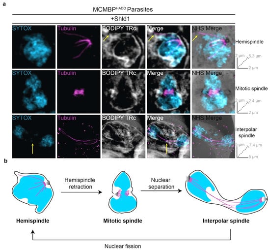 - Simon, C.S.; Funaya, C.; Bauer, J.; Voβ, Y.; Machado, M.; Penning, A.; Klaschka, D.; Cyrklaff, M.; Kim, J.; Ganter, M.; et al. An extended DNA-free intranuclear compartment organizes centrosome microtubules in malaria parasites. Life Sci. Alliance 2021, 4, e202101199. [Google Scholar] [CrossRef]