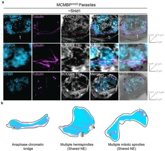 3.4. MCMBP-Deficient Parasites Form Anaphase Chromatin Bridges, Leading to Uneven DNA Segregation and Aneuploidy but Still Form Subpellicular Microtubules