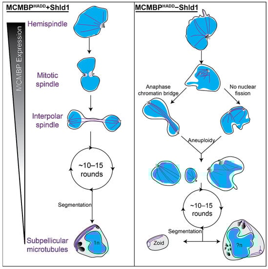 - Absalon, S.; Dvorin, J.D. Depletion of the mini-chromosome maintenance complex binding protein allows the progression of cytokinesis despite abnormal karyokinesis during the asexual development of Plasmodium falciparum. Cell. Microbiol. 2020, 23, e13284. [Google Scholar] [CrossRef] [PubMed]
