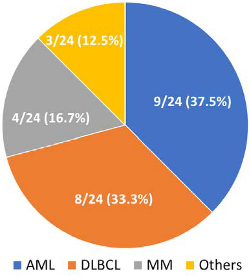 Pie chart demonstrating the underlying hematologic malignancies in the 24 enrolled patients.