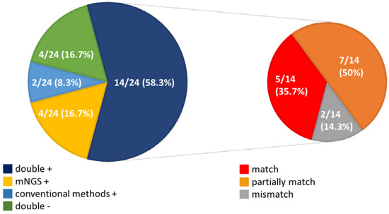 In our results, mNGS and conventional methods (blood cultures, serology testing and virus RT-PCR) were both positive in 14 (58.3%) cases and were both negative in four (16.7%) cases. Four patients were positive by mNGS only (16.7%) and two were positive by conventional methods only (8.3%) (Figure 3). For the double-positive subgroup, a high proportion of complete matching (5/14, 35.7%) and partial matching (at least one pathogen identified in the test was confirmed by the other) (7/14, 50%) was seen, with only two conflicts between mNGS and conventional methods.