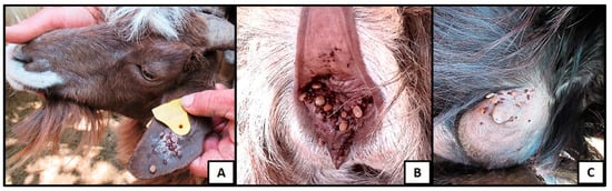 Tick infestations: (A) Ear lobe, (B) vulva, and (C) udder.