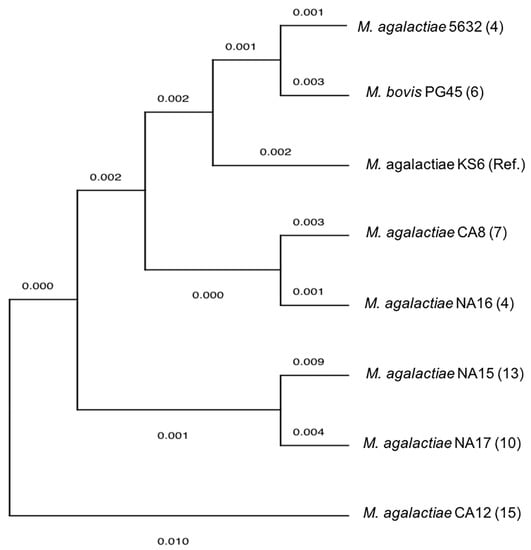 - Pettersson, B.; Leitner, T.; Ronaghi, M.; Bölske, G.; Uhlen, M.; Johansson, K.E. Phylogeny of the Mycoplasma mycoides cluster as determined by sequence analysis of the 16S rRNA genes from the two rRNA operons. J. Bacteriol. 1996, 178, 4131–4142. [Google Scholar] [CrossRef][Green Version]