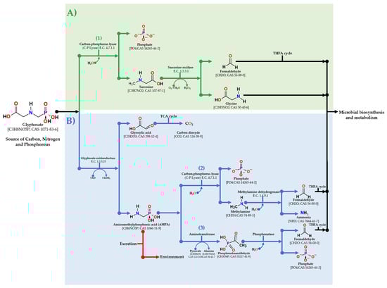 Principal glyphosate biodegradation pathways in bacteria. (A) Carbon-phosphorous lyase pathway (C-P lyase), (1) glyphosate degradation through sarcosine release as reported in Pseudomonas sp. PG2982 [148]. (B) Glyphosate oxidoreductase pathway (GOX pathway), (2) AMPA degradation in methylamine as reported in Arthrobacter sp. GLP-1 [149] and Flavobacterium sp. GD1 [150], and (3) alternative AMPA degradation pathway through the aminotransferase activity as reported in Ochrobactrum anthropi [151].