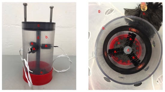 Photos of the bioelectrochemical reactor parts: (a) carbon brush electrodes serving as anodes, (b) polycarbonate core tube, (c) lid, (d) center rod, (e) perforated bottom partition, (f) septum, (g) perforated plastic beaker, and (h) cathode.