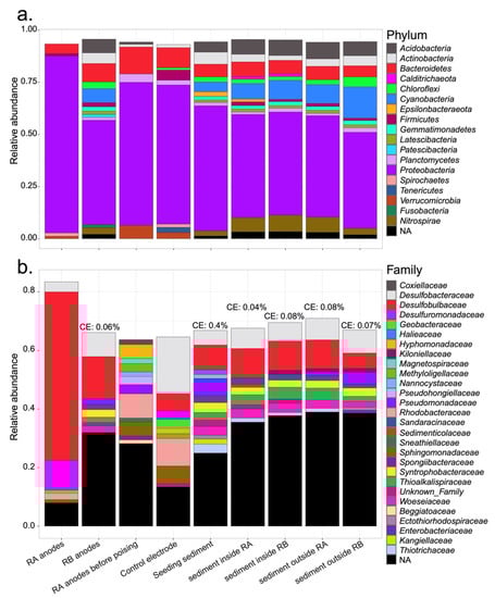 The relative abundances of (a) phyla and (b) families within Proteobacteria covering >1% of microbial communities. CE: a candidate cable bacteria genus, Ca. Electrothrix. NA stands for those that have not been assigned by the SILVA 132 database. Unknown Family is a family within the Proteobacteria that have been recognized by the SILVA 132 database but has not been given a name.