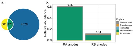 (a) Venn diagram of the common members of anodic communities in reactor A and B. A total of 171 amplicon sequence variants (ASVs) are shared. (b) The relative abundance of the shared taxa in each sample.