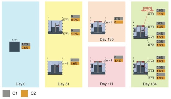 The two reactors were first monitored at open circuit without capping for 31 days. On day 31, the two reactors were capped to create fully anoxic conditions inside the core tubes holding sediment and seawater. It took approximately 14 and 1 day(s), respectively, for the environments around anodes of RA and RB to reach anoxic conditions. Once anoxic conditions were established, the cathode versus anode potentials were set at 300 mV using two custom-designed potentiostats (NW Metasystems, Bainbridge Island, WA, USA). This potential regulation raised anodic potentials to about 30 mV vs. the Ag/AgCl reference. In RA, one of the three electrodes inside the reactor was disconnected from the circuit to serve as a control and the other two electrodes were poised. In RB, all three electrodes inside were poised. A multichannel data logger (Agilent Technologies, Santa Clara, CA, USA, model 34970A fitted with two 34901A multiplexer modules) was used to record electrical potentials of the whole cell and the anodes (versus reference), and the current between anodes and cathode every 7 min. Seawater in the cooler was maintained at 15 °C by using a commercially available aquarium chilling system and bubbled to maintain air-saturation throughout the experiment. The cooler was covered with a black lid to prevent evaporation during operation.