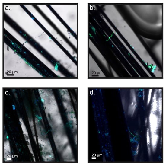 (a,b) Confocal laser scanning microscope images showing filaments and colonies belonging to the Desulfobulbaceae family on the surfaces of anode carbon fibers of reactor A. (c,d) Confocal laser scanning microscope images showing filaments and colonies belonging to the Desulfobulbaceae family on the surfaces of anode carbon fibers of reactor B. Alexa Fluor 488, green was catalytically deposited alongside with the DSB706-HRP probe and DAPI, and blue was applied as a counterstain.