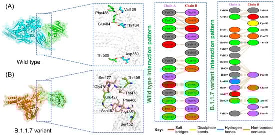 Protein interactions and networks are crucial for regulating cellular processes and activities. Investigation of protein interactions by determining their strength plays a critical role in understanding the biological relevance of the macromolecular association. Any discrepancy in protein–protein interrelationships can result in physiologically defective pathways, which can lead to pathological conditions. The interaction of proteins in cells is a complicated process; in many illnesses, the interacting interface is a significant target for clinical application. Any mutation at the interface site can influence binding and activity directly. Exploring the binding of various proteins, specifically SARS-CoV-2, would help in the development of novel treatment methods. This may also unveil the interactions of RBD and spike glycoprotein with the host receptors involved in progression of the infection. In this regard, docking of RBD and ACE2 has been reported previously as an effective strategy to understand how SARS-CoV-2 interacts with the host and triggers the infection process. Here, a similar approach was employed using the HADDOCK docking algorithm to determine the binding mode of the GRP78 with the wild-type and variant RBDs. From the docking analysis, it was interpreted that most of the interacting residues are the same; however, some difference between the wild-type and variant interacting residues was observed. In the case of the wild-type, the docking score was reported to be −205.36 kcal/mol with four hydrogen bonds and 67 non-bonded contacts. As shown in Figure 2A, the wild-type spike with the GRP78 receptor formed four hydrogen bonds by interacting with residues Glu484-Thr434, Phe486-Val429, and Thr500-Asp350. Glu484 has been previously reported to be actively involved in interaction with GRP78 [11]. Similarly, a total of seven hydrogen bonds and two salt bridges were formed, and the docking score for B.1.1.7 was reported to be −289.67 kcal/mol (Figure 2B). The interacting residues of the B.1.1.7 variant comprise Ser452, Glu427, Gly476, Ser477, Thr458, Thr478, Gly485, Phe486, and Asn487. The interaction formed by Asn487 and Ser452 are also preserved here and are reported to be critical for stronger interactions and recognition [11,14].