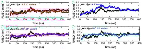 Deciphering conformational dynamics of the SARS-CoV-2 spike variants/wild-type complexed with the human GRP78 receptor is key to a better explanation of the complex’s stability/instability and prediction of the mutation’s impact on the structure, function, and overall binding. This further implicates the virus fitness for the host in terms of attachment, infection, and transmissibility. Conformational dynamics of the analyzed complexes were understood via calculating RMSD with respect to the 400 ns time period. As shown in Figure 5A, the wild spike-GRP78 complex is subject to continuous fluctuations until 185 ns. It gained equilibrium and showed dynamics with a net RMSD of ~0.8 nm until the end of the simulated time. The highest RMSD surge reaches ~1.4 nm at 140 ns. It seems that the interaction between these two molecules was initially unstable and experienced several structural adjustments to obtain the fittest conformation with respect to each other. The structural adjustments allow the intermolecular binding to become highly stable with time, and the stable binding mode of the molecules could be achieved at the end. The GRP78-B.1.1.7 RMSD is more stable compared to the wild-type, although the plot is inconsistent. The maximum RMSD reported for this system reached 0.9 nm, while the lowest RMSD revealed was around 0.3 nm. Thus, it can be inferred that the GRP78-B.1.1.7 interaction experienced fewer structural variations in which few bonds were broken, and some new bonds were established to strengthen the binding. The structure showed more stable behavior between 350–400 ns. The GRP78-P.1 variant depicted stability until 50 ns with deviation around 0.4 nm and then experienced a minor structural deviation phase until 90 ns. Afterward, the system RMSD continuously upsurged, reaching an RMSD of 1.6 nm. RMSD was observed to be in continuous decline toward the end, achieving a mean of approximately 0.8 nm. During the last 150 ns (250–400) the structure gained significant stability and ended up with 0.8 nm. The GRP78-B.1.351 variant RMSD’s behavior was stable until 210 ns, followed by a minor variability phase, and then gained significant stability at the end. Similarly, this complex also demonstrated greater stability during the last 150 ns. The GRP78-B.1.617 variant exhibited stability for the first 150 ns, with an RMSD of ~0.6 nm, then experienced a small surge and slowly declined until 260 ns, followed by a sudden increase at the end, where RMSD reached 0.8 nm and remained consistent until the end of the simulation. These findings suggest a stable evolution of these variants and thus support the stable binding pattern. Therefore, our inferences are in strong correlation with the findings of previous studies. As previously reported, global RBD stability contributes to ACE2-binding affinity [31]. A strong relationship between the RBD stability and affinity is corroborated by previous findings, in which mutations that increase the structural stability and rigidity escort upsurges in binding affinity [32,33]. For instance, other findings, which reported a destabilizing mutation C432D in RBD, lessened ACE2 assisted entry to the cell using a spike trimer [31]. In the recently reported mutations, those in UK, South Africa, Brazil and other countries, the stability also increased and claimed a stable evolution of the new variants. Studies have shown clearly that the environmental pH plays a key part in SARS-CoV-2 infection as demonstrated by the pH (6.3) requirement for virus entry and its genome release (pH < 6) endosomes along with pH of the export secretory pathway (pH 5.5) for newly assembled viruses [34,35]. pH variation with respect to SARS-CoV-2 variant cell entry and exit has been discussed. It is reported that the D398 variant allows pH-dependence open/close equilibrium of the spike, which is coupled potentially to the impact of D614G mutation and linoleic acid-binding. This is also possibly linked to A570D mutation [34]. Also, it is reported that pH does not trigger the conformational changes of the spike protein from the “down” to the “up” state [36]. As can be exemplified by no significant changes in the spike protein conformation in CryoEM at pH 5.6 in contrast to the neutral-pH for SARS-CoV-1 [37]. Previous studies have shown a close association between RBD stability and affinity, with mutations that maximize structural stability and inflexibility causing upsurges in binding affinity [14,15]. The RMSDs of all the complexes are given in Figure 5.