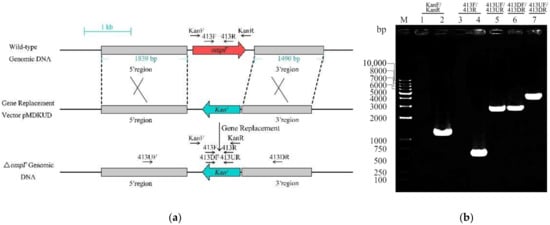 Construction and verification of the ompF deletion mutant. (a) Schematic representation of the ∆ompF construction via homologous recombination. (b) Verification of ompF homologous recombination events. Lane M, DL10000 marker; lanes 1 and 2, amplified with KF/KR, WT and ΔompF as templates, respectively; lanes 3 and 4, amplified with 413F/413R, ΔompF and WT as templates, respectively; lane 5, amplified with 413UF/413UR, ΔompF as template; lane 6, amplified with 413DF/413DR, ΔompF as template; lane 7, amplified with 413UF/413DR, ΔompF as template.