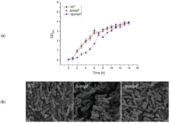 Growth and cell morphology of C. sakazakii in LB medium. (a) Growth of C. sakazakii in LB medium. Error bars represent the standard deviations from independent experiments performed in triplicate. (b) SEM to observe the cell morphology of WT, ΔompF and cpompF. Panels: WT, C. sakazakii ATCC BAA-894; ΔompF, mutant strain; cpompF, complementation strain.