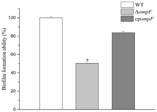 A crystal violet staining assay was performed to study the influence of the ompF gene on the biofilm formation ability of C. sakazakii. Percentages of biofilm formation for the mutant and complementation strains relative to the WT strain are shown in Figure 3. The ability of biofilm formation in ΔompF was significantly less (1.99-fold) than that by WT, while the complement strain showed similar biofilm formation ability to WT. These results indicated that the ompF gene played an important role in biofilm formation.