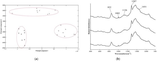 Comparison of the spectral features of C. sakazakii biofilms using Raman spectroscopy. (a) Principal component analysis of biofilm composition in C. sakazakii WT, ΔompF and cpompF strains. (b) Comparison of the spectral features of C. sakazakii biofilms using Raman spectroscopy. (A): complement strains, (B): mutant, (C): wild_type.