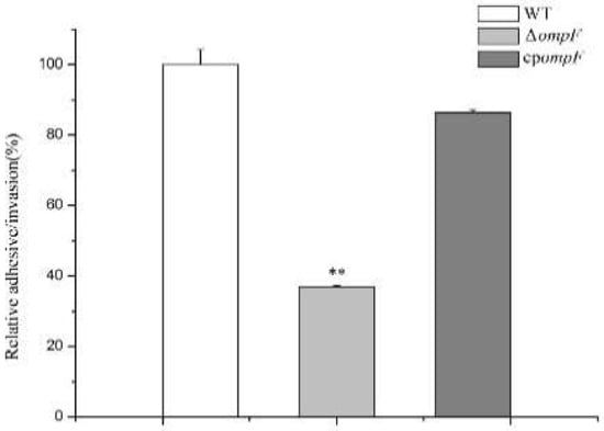 The ability of adhesion to and invasion of tissue cells is considered to be essential in most pathogenic bacteria. An adhesion/invasion assay was conducted to determine the virulence-related functions of the ompF gene in C. sakazakii. The ΔompF mutant showed significantly decreased (2.7-fold less than that of the WT) adhesion to and invasion of HCT-8 cells (Figure 6). However, the invasion of HCT-8 cells by the complement strain was similar to that by WT (Figure 6). The results suggested that ompF is a positive factor in the process of adhesion to and invasion of host cells by C. sakazakii.