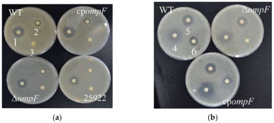 Antibiotic resistance of the C. sakazakii WT, ΔompF and cpompF strains. (a) 1, 2, 3 and the corresponding positions on the other plates represent gentamicin, ampicillin and penicillin, respectively; (b) 4, 5, 6 and the corresponding positions on the other plates represent tetracycline, ciprofloxacin and kanamycin, respectively.